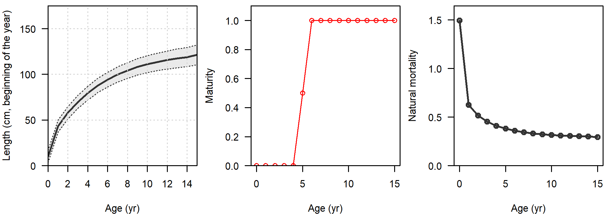 Natural mortality (M) was age-specific and parametrized following Lorenzen (1996), with a reference M equal to 0.36 for age 6 based on the assumption of a maximum age of 15 years (Hamel and Cope, 2022). Maturity-at-age was knife-edge, with 50% at age-5 and 100% thereafter. Fecundity was proportional to body weight. Growth was parametrized following the von Bertalanffy curve (Schnute, 1981) and parameters were estimated within the model. Variability of lengths-at-age was assumed to be a function of age. Figure 4 shows a summary of the biological parametrization.