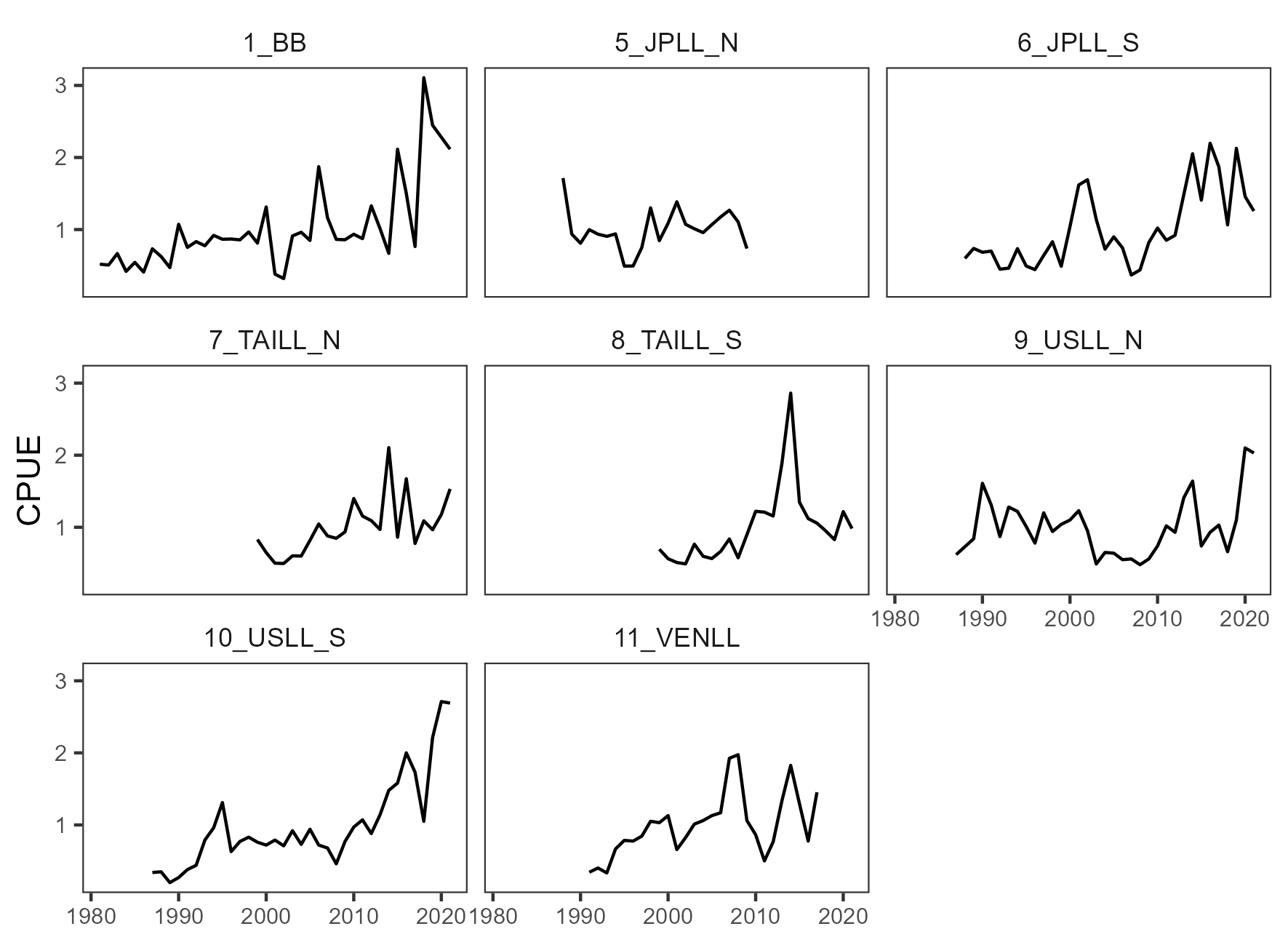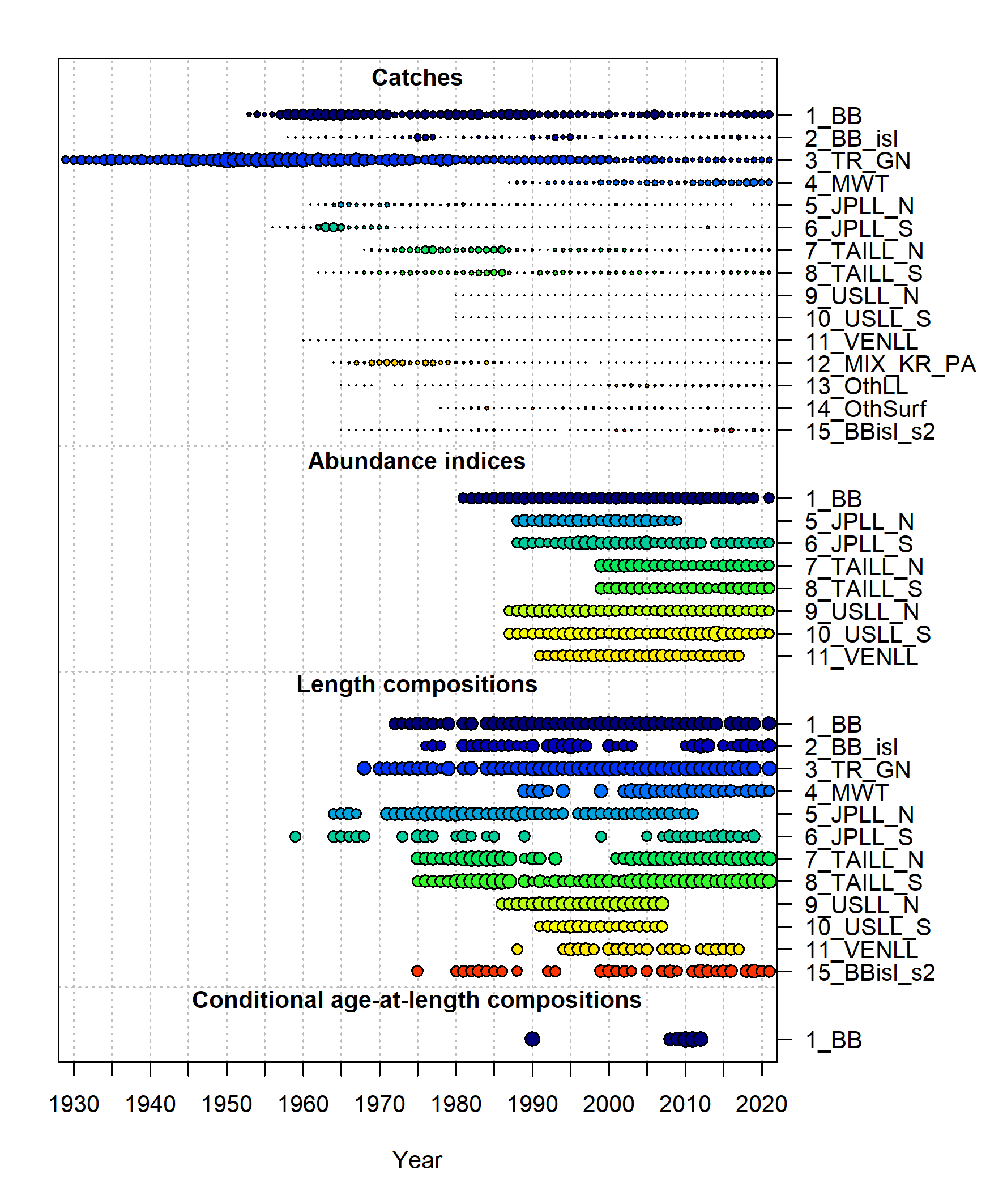 The period covered was from 1930 to 2021. The assessment mainly used landings data from longline (LL) and baitboat (BB) fleets, with a total of 15 fleets included in the model (Table 1 and Figure 2). There were seven LL and one BB (Spain and France) catch-per-unit-effort (CPUE) indices (Figure 3). The catchability coefficients for the CPUE indices were assumed to be time-invariant.