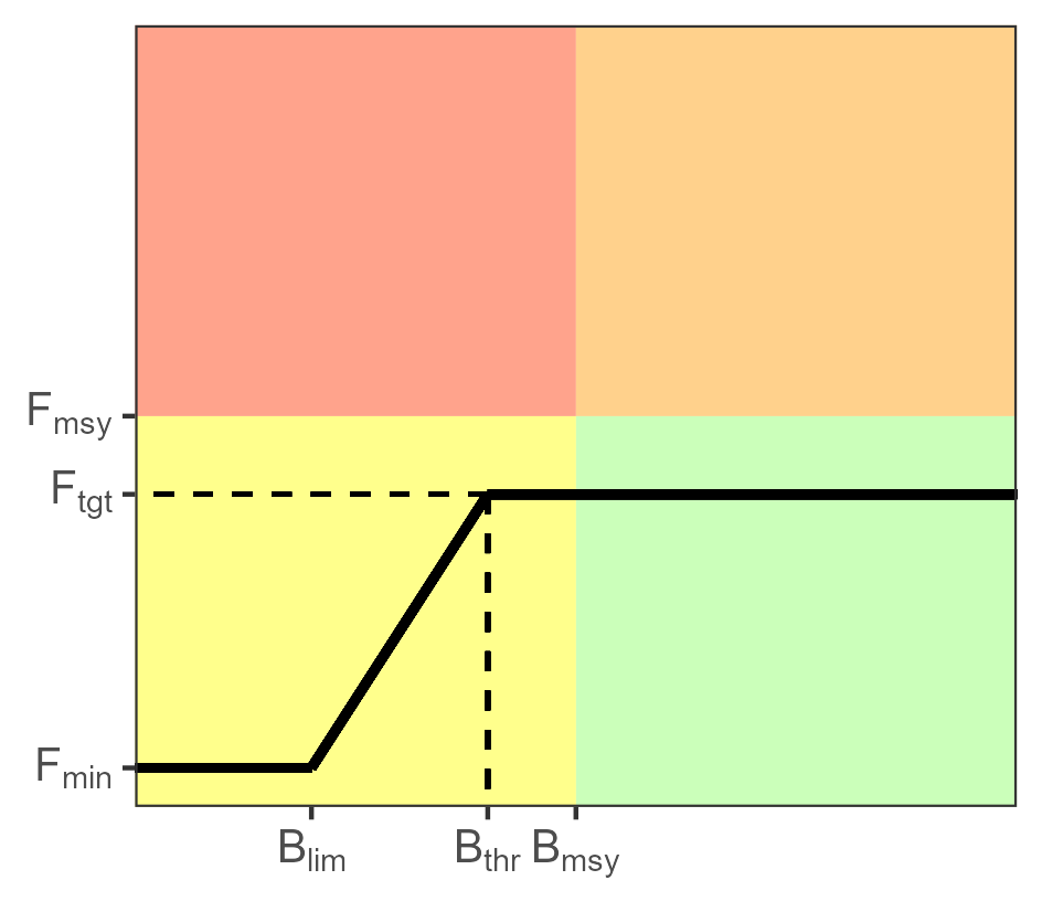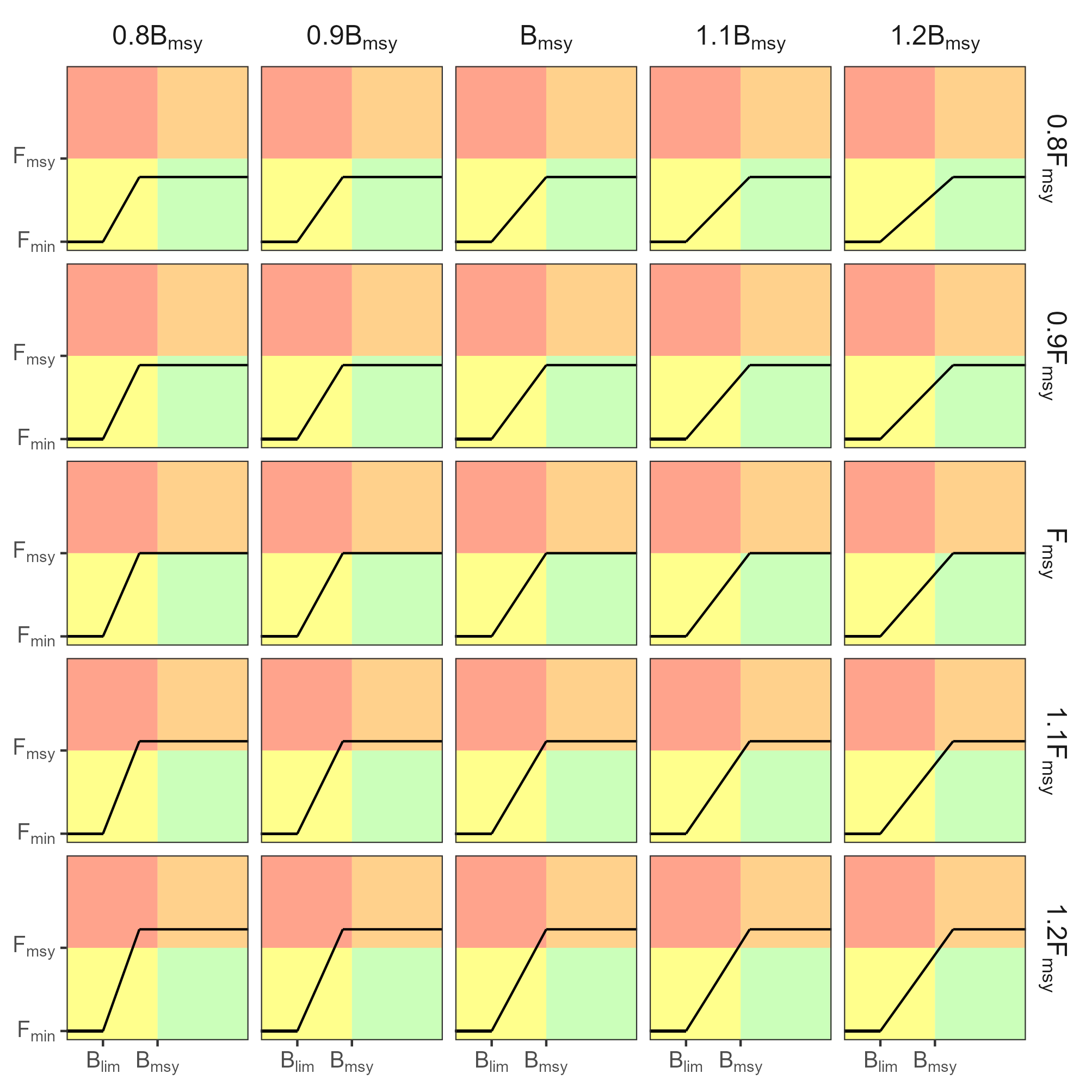 The management advice is given every three years (management period) and the total allowable catch (TAC) is derived from a harvest control rule (HCR, Figure 7). We evaluated a total of 15 HCRs produced by the combinations of \(F_{tgt}\) and \(B_{thr}\) shown in Figure 8. \(B_{lim}=0.4\times B_{msy}\) and \(F_{mim}=0.1\times F_{msy}\) for all cases. In addition, we imposed the following restrictions: