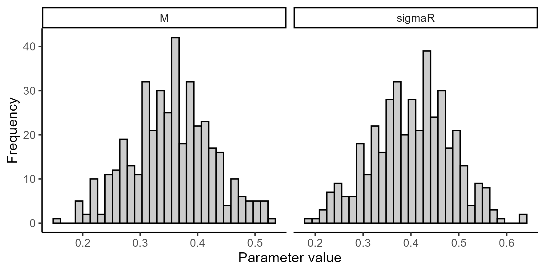 Per weighting scenario, 400 models were run in SS3 by randomly varying the M and sigmaR values sampled from a normal distribution with mean 0.36 and 0.4, respectively, and a coefficient of variation of 0.2 (Figure 5).