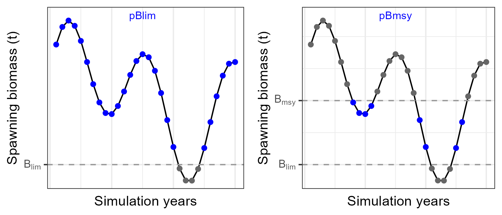 | Safety | Probability of \(B>B_{lim}\) | \(pBlim\) | Proportion of years that \(B>B_{lim}\) |